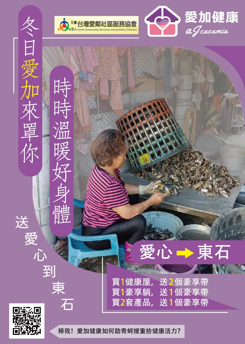 為了讓更多的青蚵嫂接觸到優質遠紅外線帶來的益處,並且讓大家一起送愛心,即日起愛加健康每售出1部愛加健康屋,愛加將送出2個愛加豪享帶;每售出1部愛加豪享躺或2套產品(愛加豪享座+愛加豪享帶+愛加喜樂毯),愛加將送出1個愛加豪享帶,由東石愛鄰協會協助將愛加豪享帶交給有需要的人。