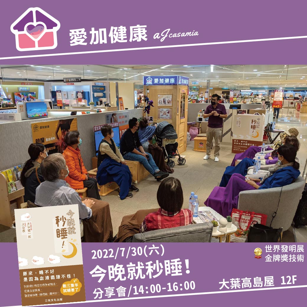 愛加健康將於7/30(六)舉辦好書分享,《今晚就秒睡》讓您健康帶著走、好康享更多。歡迎來電報名!