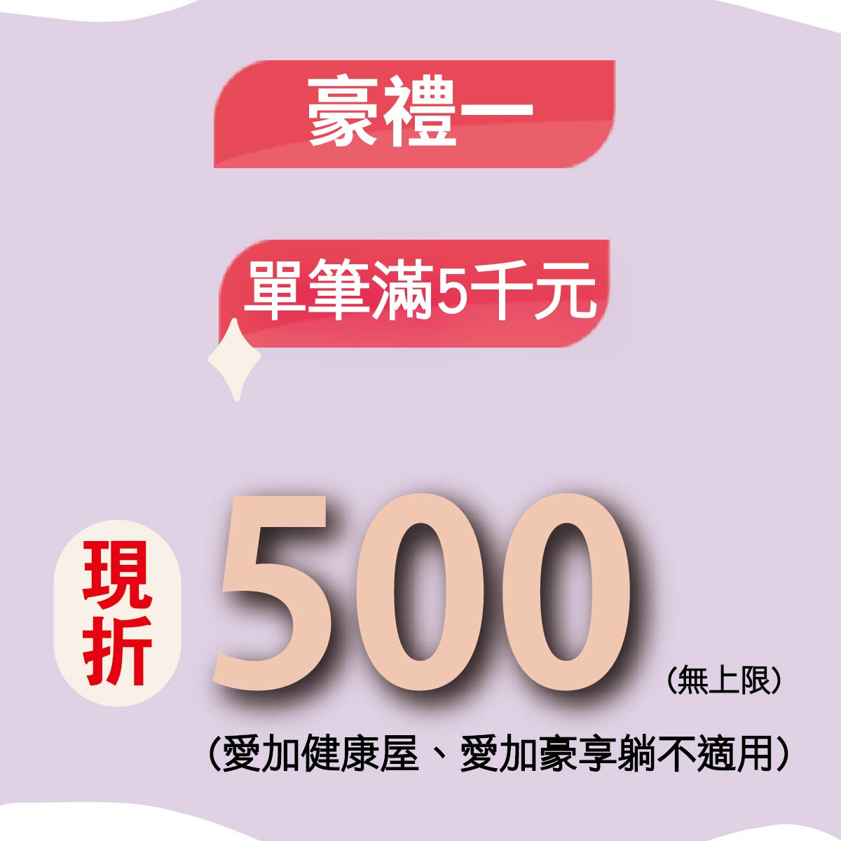 ◎健康屋、豪享躺不參加滿5000折500,但滿額禮、電子購物金、抽獎(不限定張數)與百貨活動皆可參加