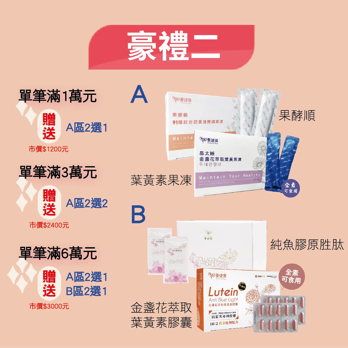 -單筆滿6萬送『果酵順 或 葉黃素果凍』(2選1)+『魚膠原蛋白 或 葉黃素膠囊』(2選1)價值$3000