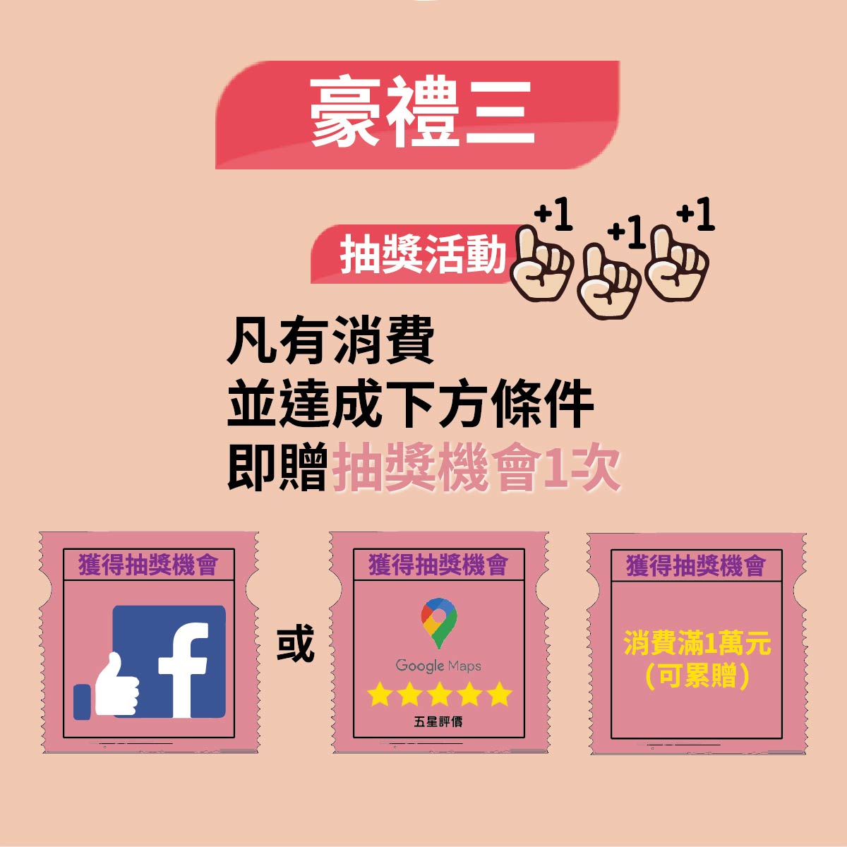 結帳金額滿1萬元贈一次『抽獎機會』,可累贈